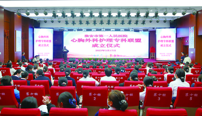 本报讯 日前,淮安市第一人民医院心胸外科护理专科联盟成立大会召开。省护理学会理事长霍孝蓉、市卫健委副主任俞伟男和市一院党委书记徐克平,纪委书记顾芝梅,护理部主任张青,护理部副主任陈梅、张春艳,心胸外科主任赵建强,心胸外科副主任吴清泉、尤振兵、徐志伟,护理部科护士长杨瑛以及市内外21家联盟单位代表出席会议。会议由张青主持。