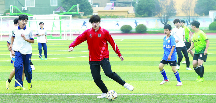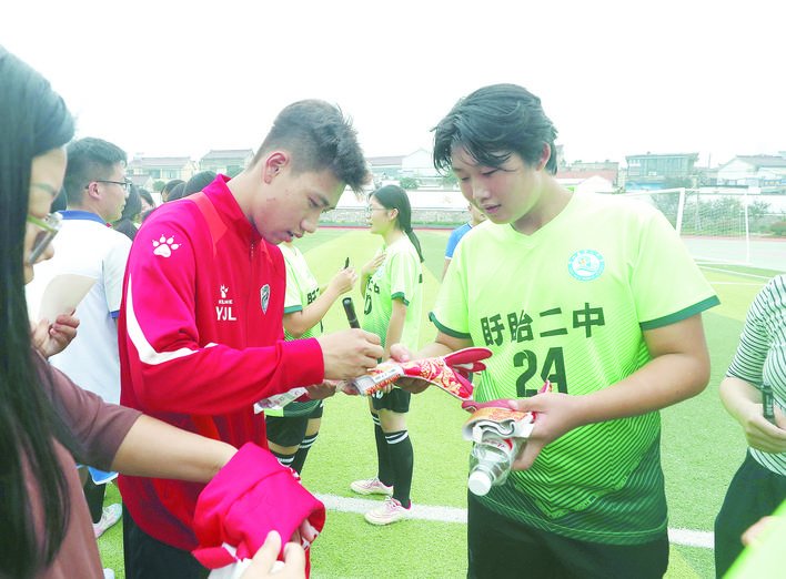 昨日,“苏超”淮安队队员走进盱眙县第二中学,与该校足球队队员开展足球技巧交流活动。淮安队队员向学生们展示足球技巧,与他们进行友谊对抗赛,切磋球技,并为学生们签名,激励学生们勇往直前、逐梦绿茵赛场。■记 者 赵启瑞