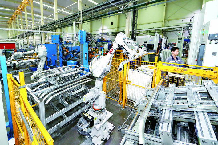 近年来,我市不断提升规上工业企业数字化转型覆盖率,逐步建成一批省级互联网标杆工厂和智能制造示范工厂(车间),以产业升级为笔,绘就经济发展新画卷。图为10月11日,在江苏和兴汽车科技有限公司智能生产车间,机械臂挥舞,铝制汽车部件在自动化流水线上快速成型。