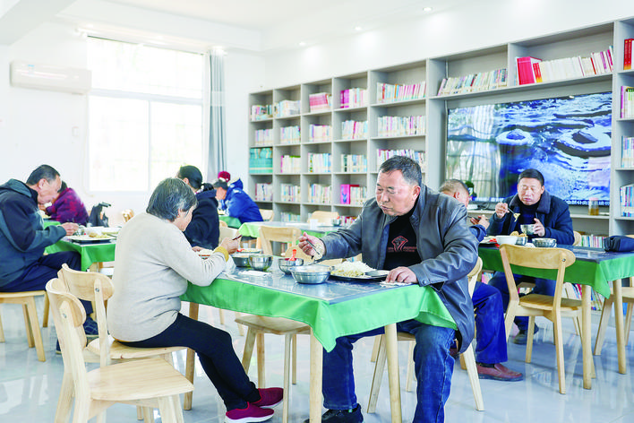 昨日,在洪泽区三河镇涧前村助餐点,老人们在吃午餐。该村通过“个人每顿出五元、政府补一点、村里贴一点”的模式,解决村里部分六十岁以上老年人的吃饭难题。■通讯员 万 震