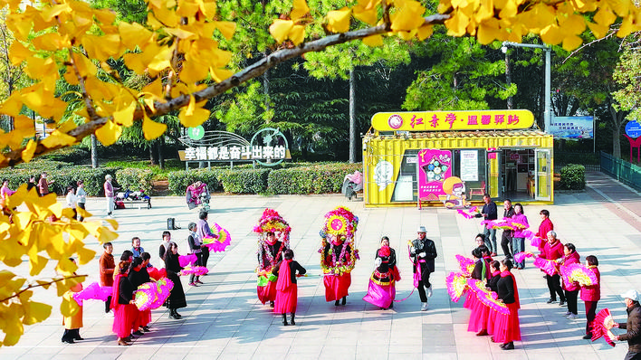近年来,淮安经济技术开发区在居民小区周边建设便民健身广场,市民在“家门口”就可实现“运动自由”。图为近日,市民在健身广场表演花船舞。