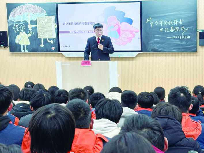 共筑校园防护网络。12月4日,周海兰与小营法庭法官徐燕红赴淮阴区开明中学,为全体师生作未成年人保护专题法律宣讲。徐燕红从司法实践出发,系统阐述未成年人保护法律体系,重点讲解防止网络沉迷、妥善处理人际关系等热点问题,结合案例剖析不良行为的危害与后果,强调建立家庭、学校、社会、网络、政府、司法“六位一体”保护格局的重要性,呼吁共同为青少年成长营造清朗环境。