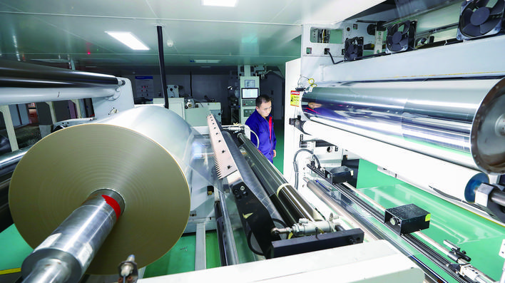 近年来,盱眙县聚焦产业链培育,集聚新一代电子信息、新材料产业链企业近170家,以科技创新驱动产业升级,赋能高质量发展。图为日前,位于该县的江苏宇狮薄膜科技有限公司车间,员工加紧生产烫印膜等功能性薄膜产品。