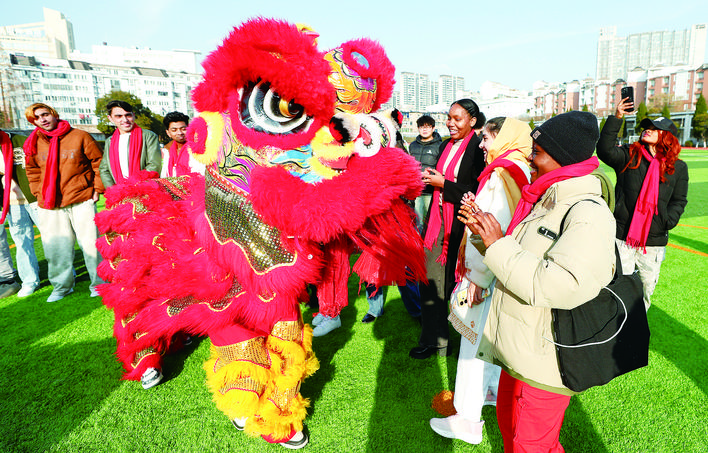 近日,淮阴师范学院的留学生和中国学生一起练习舞狮,体验中国传统文化,欢欢喜喜迎新年。■记 者 赵启瑞 通讯员 柏 华 唐 瑀