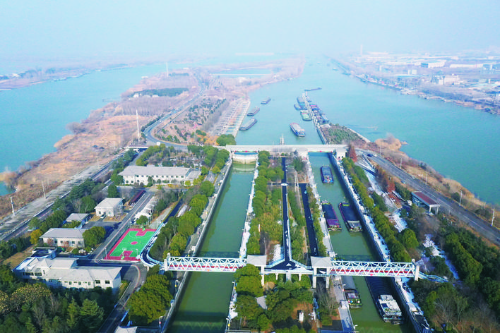 随着春节临近,洪泽湖、苏北灌溉总渠水上航线装载年货的船舶往来穿梭,一派繁忙运输景象。图为日前,船舶有序通过高良涧复线船闸。