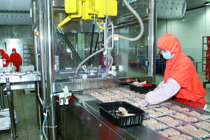 近年来,我市肉制品生产企业依托中央厨房平台优势,源源不断地为企事业单位食堂、连锁餐饮企业以及广大消费者提供高品质肉类产品。图为近日,一企业员工在加紧生产肉制品。■记 者 刘志钧 通讯员 赵叶萱