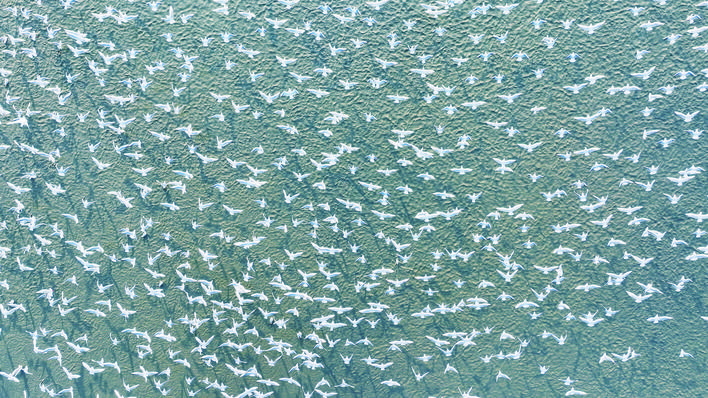 近日,洪泽湖古堰景区迎来今年首批越冬候鸟。站在大堤上远眺,雪白的红嘴鸥在湖面上飞翔,尽显自然和谐之美。■陈凯 摄